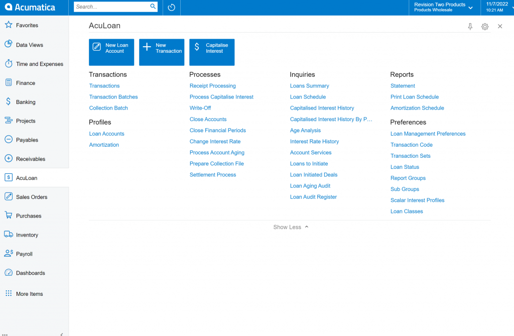 Like Acumatica, AcuLoan has several built-in reporting features that come out of the box. Reporting is essential to the management of loans and many of the reports in AcuLoan show vital information for keeping loans up-to-date, payments processed, and ensuring loans are transacting in the proper way. Some of the reports that are included with AcuLoan are the loan summary, loan schedule, and transaction history report. Above is a full view of the inquiries and reports available in the AcuLoan workspace.